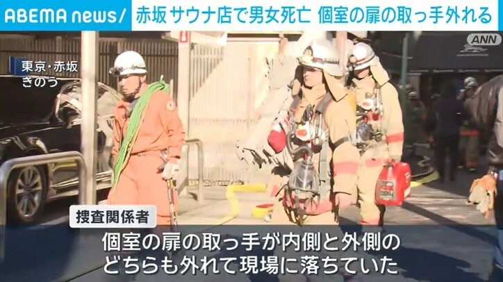 赤坂 サウナ店で男女死亡 個室の扉の取っ手外れる 速報 2025/12/16 15:05 拡大する 東京・赤坂の高級個室サウナ店で客の30代の男女が死亡した火事で、2人が入っていた個室の扉の取っ手が外れていたことがわかりました。 15日、港区赤坂の高級個室サウナ店の個室で火事があり、30代の男女の客が意識不明の状態で病院に搬送され、その後、死亡しました。 2人は個室の入り口付近で倒れていましたが、その後の捜査関係者への取材で、個室の扉の取っ手が内側と外側ともに外れていて、現場に落ちていたことがわかりました。2人が個室に入ってから外れたとみられていて、出火後に出られなくなっていた可能性もあるということです。 続きを読む