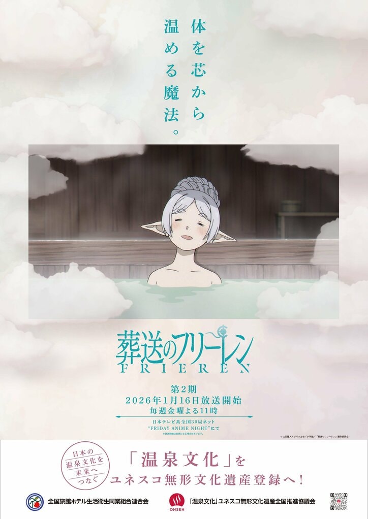 フリーレンが温泉に浸かるポスター公開!アニメ『葬送のフリーレン』第2期、全国の温泉宿とタイアップ 葬送のフリーレン 2025/12/17 16:50 拡大する アニメ『葬送のフリーレン』より、“体を芯から温める魔法”というキャッチフレーズと共に温泉/お風呂コラボポスターを展開することが決定した。 アニメ「葬送のフリーレン」は、「週刊少年サンデー」で連載中の原作・山田鐘人氏、作画・アベツカサ氏による同名漫画が原作。魔王が討伐された“その後”の世界を舞台に、1000年以上生きる魔法使いのフリーレンが “人を知るための旅”に出る物語だ。数々の賞を受賞するなど高い評価を得る原作コミックスは、累計発行部数3200万部を突破。2026年1月16日よりテレビアニメ第2期が放送されることが決定している。第2期の放送を記念して、12月18日には、公式ファンブック「フリーレン&ヒンメルがわかる魔法」と「フェルン&シュタルクがわかる魔法」が小学館から2冊同時発売される。 続きを読む 2025秋アニメ(10月クール) 作品情報 もっとみる(74) 破産富豪 The Richest Man in GAME 味方が弱すぎて補助魔法に徹していた宮廷魔法師、追放されて最強を目指す 友達の妹が俺にだけウザい ギルティホール ある日、お姫様になってしまった件について モンスターストライク デッドバースリローデッド