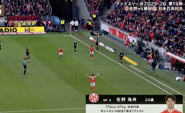 一体、何が… 佐野海舟、ボールを叩きつけて怒った?「熱いやん」「気持ち入ってる」感情が爆発した珍しいシーンにファン騒然 ブンデスリーガ 2025/12/22 06:46 拡大する 【ブンデスリーガ】マインツ 0-0 ザンクトパウリ(日本時間12月21日/メーヴァ・アレーナ)マインツに所属する日本代表MFの佐野海舟が珍しく感情を爆発させた。判定に納得がいかず、その際に見せた行動にファンが反応している。最下位に沈むマインツは、日本時間12月21日のブンデスリーガ第15節で、16位のザンクトパウリと対戦。佐野と藤田譲瑠チマが対峙する日本人対決が実現した。この日の佐野は、藤田にパスコースを消されるような守りをされたことで、しばしばプレーが限定される場面も。ABEMAで解説した鄭大世氏も「藤田のプレーで今日の佐野はずっと苛立っている」と指摘した。 続きを読む