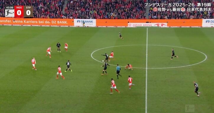 「容赦ないな…」佐野海舟、強烈な“爆速タックル”→藤田譲瑠チマを吹っ飛ばす「バチバチだな」日本代表同士の激しい肉弾戦にファン大興奮 ブンデスリーガ 2025/12/22 11:50 拡大する 【ブンデスリーガ】マインツ 0-0 ザンクトパウリ(日本時間12月21日/メーヴァ・アレーナ)マインツに所属するMF佐野海舟が、日本代表のチームメートであるザンクトパウリのMF藤田譲瑠チマと激しい攻防を見せた。最下位に沈むマインツは、日本時間12月21日のブンデスリーガ第15節で、16位のザンクトパウリと対戦。佐野と藤田が対峙する日本人対決が実現した。試合中に何度もマッチアップする場面を迎えた両者だが、中でもファンは44分のシーンに反応。佐野がセンターサークル付近でMFジャクソン・アーヴァインからボールを奪うも、引っかかってしまいロストした。佐野がバランスを崩したところを狙っていた藤田が、ボールを掻っ攫って前進する。これに対して、MFイ・ジェソンがスライディングで藤田の突破を少し遅らせることに成功。次の瞬間には佐野が体勢を立て直して追撃態勢に。一瞬の加速で間合いを詰めて、藤田の後方からスライディングでボールをかき出したのだ。 続きを読む