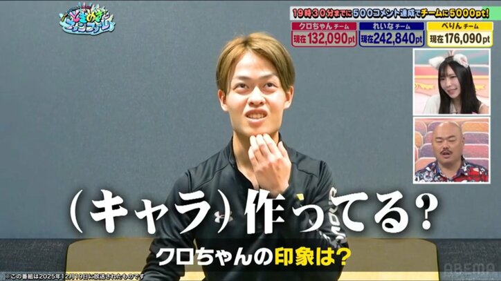 「キャラは作ってる?」に監視カメラ生活の安田大サーカス・クロちゃん「作ろうにも作れないですよ」 ボートレース 2025/12/22 13:45 拡大する テレビでのキャラクターは作っているのか否か。「ABEMA BOATRACE COLORS『ときめきファンファーレ』」12月19日生放送回では、MCの安田大サーカス・クロちゃんが、その疑問に答える場面があった。 番組では、ミニコーナー「イチ推しボートレーサー」を実施した。ピックアップしたのは静岡支部所属の新人・豊田祥生選手。様々な質問をするうち、スタッフがクロちゃんの印象を聞いた。これに豊田選手は「普通にヤバい」と返答。「あれ(キャラ)って作ってるんですか?本当はいい人って聞いた…みたいな。『水曜日のダウンタウン』とか『大脱出』も見ました。あのクロちゃんって、本当に本心でやってるんですか?僕は作ってるんじゃないかって思います」と告げた。 続きを読む