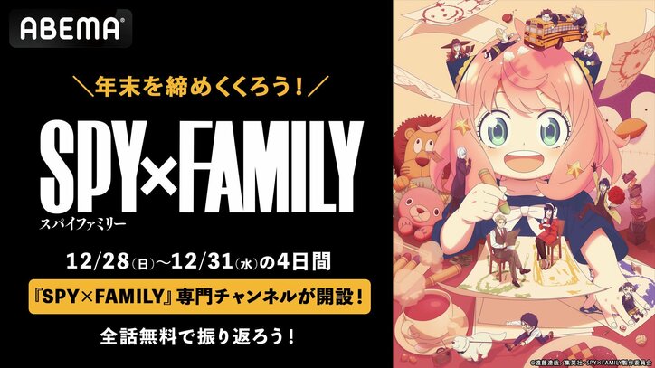 アニメ『SPY×FAMILY』ABEMAで全話無料放送が決定!12月28日から大晦日まで SPY×FAMILY 2025/12/26 07:00 拡大する ABEMAにて、TVアニメ『SPY×FAMILY』専門チャンネルが2025年12月28日(日)より期間限定で開設されることが決定した。これに伴い、同日から12月31日(水)までの4日間、シリーズ全50話の無料一挙放送が実施される。 本企画は、ABEMAが実施する特別企画「年末年始 アニメ無料大放出祭」の一環として行われるもの。対象となるのは、2022年放送のSeason 1、2023年放送のSeason 2に加え、2025年10月に放送されたばかりのSeason 3を含む全シリーズとなる。 続きを読む 2025秋アニメ(10月クール) 作品情報 もっとみる(74) 終末ツーリング SPY×FAMILY Season3 父は英雄、母は精霊、娘の私は転生者。 キミと越えて恋になる 矢野くんの普通の日々 笑顔のたえない職場です。