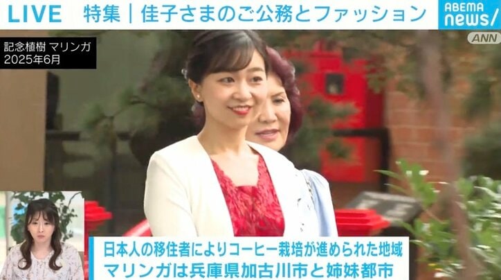 この服装について角氏は「これはあるブランドのお召し物だが、胸元がけっこう開いているものに当て布をされて、控えめにお直しされた。白と赤のツートーンカラーの着こなしは難しい配色だが、おそらくブラジルに住んでいる日本人の方に寄り添ったメッセージとして『日の丸カラー』を意識されたのではないか」と分析。