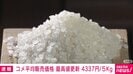 農水省によりますと、12月21日までの1週間に全国のスーパーおよそ1000店舗で販売されたコメの平均価格は前の週より6円高い5キロあたり4337円でした。2週連続の値上がりで、先月下旬につけた最高値を2円上回り、過去最高値を更新しました。4000円台は9月以降16週連続です。