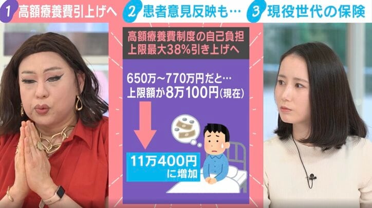 高額療養費「最大で38%」引き上げ 肉乃小路ニクヨ氏「現役世代のセーフティネット」「引き上げは慎重に考えて」 わたしとニュース 2025/12/27 11:30 拡大する 高額療養費の自己負担額引き上げ案の詳細が明らかになった。所得区分によっては、最大で現在の額の38%の引き上げとなる。 自己負担の上限額は、来年8月から2年かけて所得ごとに引き上げられる。 負担が増える割合が最も大きいのは年収およそ650万から770万円の人で、上限額が現在の8万100円から11万400円に増加する。年間で負担する額の上限が新たに設けられるなど一定の配慮も見られたが、患者団体やSNS上では怒りの声も上がっている。 続きを読む