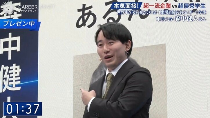 M-1出場経験もある東大生がプレゼンで“大スベリ”! 超一流企業「真面目なところを30%は入れてくれないと評価できない」 キャリアドラフト 2025/12/27 08:00 拡大する 超一流企業vs超優秀学生の疑似就活バラエティABEMA『キャリアドラフト シーズン3 #10』が12月26日に配信。M-1出場経験もある東大生のプレゼンが“大スベリ”した。 同番組は、事前面接を勝ち抜いた学生が、服装・プレゼン形式はすべて自由に、ステージ上で2分間の自己PRを実施。27新卒を対象に行われる今シーズンは企業がリニューアルされ、面接官を務めるのはなんと超一流企業の実際の人事担当者たち。13社15人による7分間の質問タイムを設け、自社の新入社員の平均を5と仮定して10点満点で採点する。学生にとっては、どんなプレゼンが企業に響くのかがわかる絶好の舞台だ。 続きを読む