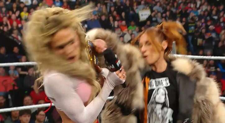 レジェンドのベッキー・リンチが、現女子インターコンチネンタル王者のマキシン・デュプリの挑発に激昂。マキシンのマイクに耐えかねたベッキーは、突如としてマキシンの顔面に鋭い“グーパン”を見舞い、馬乗りになって猛攻を仕掛けた。