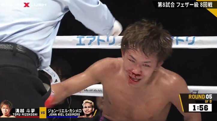 そうして迎えた5ラウンド、序盤の猛打で溝越がスリップ。ダメージの蓄積は明らかで、「やばめのスリップ」「壊されてしまう」「止めた方がいいかも」との声も上がるなか、足元が明らかに鈍り始めた溝越に対し、カシメロが右ボディから右フック、左フックまで連打をまとめる。