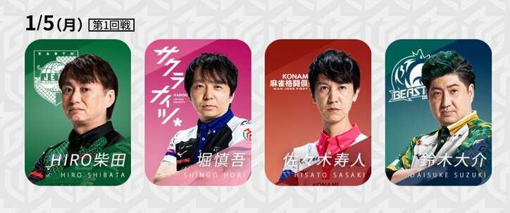 激闘のリーグ戦、再開!年明け初勝利を手にするのはどのチーム?/麻雀・Mリーグ Mリーグ 2026/01/05 19:05 拡大する Mリーグ機構は「大和証券Mリーグ2025-26」、1月5日の第1試合に出場する4選手を発表した。年末年始休みを挟んで、今日からリーグが再開。レギュラーシーズンも折り返し地点をやや過ぎたところで、ここからいよいよ順位争いもより熾烈になる。新年初勝利で幸先のいいスタートを切るのはどのチームか。 先発する4選手は、ここまで明暗くっきり。EARTH JETS・HIRO柴田(連盟)は個人31位と苦戦。KONAMI麻雀格闘倶楽部・佐々木寿人(連盟)は+44.6とまずまずだ。BEAST X・鈴木大介(連盟)は個人39位と大苦戦。また安定した力を誇るKADOKAWAサクラナイツ・堀慎吾(連盟)も同37位と低迷している。堀は所属団体を変えて初のMリーグ。心機一転の機会にできるか。 続きを読む