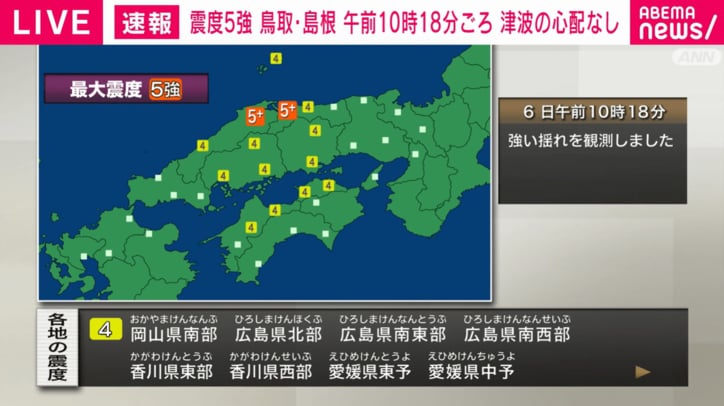 震度5強 鳥取・島根 午前10時18分ごろ 津波の心配なし 速報 2026/01/06 10:52 拡大する 気象庁によりますと、午前10時18分ごろ、中国地方で最大震度5強を観測する地震がありました。この地震による津波の心配はありません。震源は島根県東部で深さは10キロ、マグニチュードは6.2と推定されています。最大震度の5強を観測したのは、鳥取県西部と島根県東部です。 鳥取県中部や島根県西部や島根県隠岐や岡山県北部と西部などで震度4を観測しています。このほか、広い地域で揺れを観測しています。この地震による津波の心配はありません。 続きを読む
