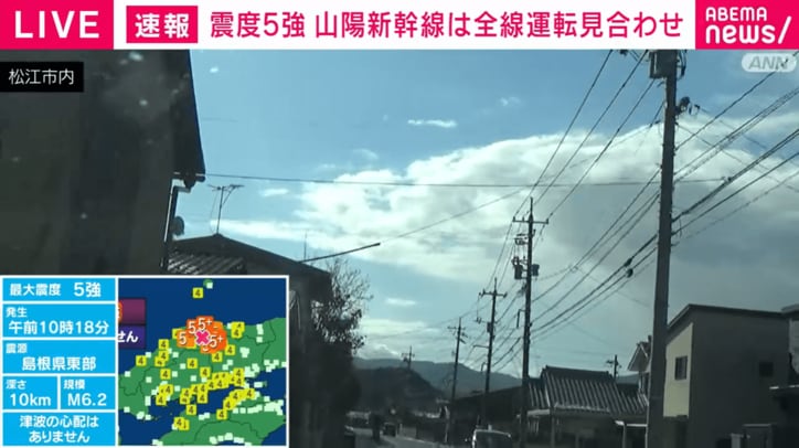 震度5強 山陽新幹線は全線運転見合わせ 速報 2026/01/06 11:13 拡大する 中国地方で最大震度5強を観測した地震で山陽新幹線は新大阪駅から博多駅の間で運転を見合わせています。 JR西日本によりますと、地震によって停電が起きたということで、運転再開の見込みについて確認しています。(ANNニュース) 続きを読む