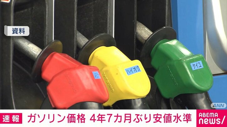 ガソリン価格 4年7カ月ぶり安値水準 速報 2026/01/07 15:27 【映像】ガソリンを給油する人ら この記事の写真をみる(2枚) 全国のレギュラーガソリンの平均価格が4年7カ月ぶりの安値水準となりました。【映像】ガソリンを給油する人ら 資源エネルギー庁によりますと、今月5日時点のレギュラーガソリンの全国平均価格は1リットルあたり155.7円でした。前回調査した去年12月22日から2.3円値下がりし、2021年6月以来、4年7カ月ぶりの安値水準となりました。 原油価格の下落が主な要因です。 来週は小幅な値動きが予想されるということです。(ANNニュース) この記事の画像一覧 【映像】一度も実家を出たことない40代男性の月収(詳細) 【画像】「なんで私?」イーロン・マスクに見つかり世界的にバズった佐保里さん 借金1000万円肩代わり “ホス狂い”の娘を持つミドリさん この記事の写真をみる(2枚) Twitter