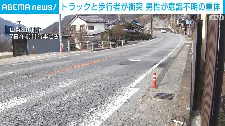 山梨県甲州市でトラックと歩行者の男性が衝突する事故があり、男性が意識不明の状態で病院に搬送されました。