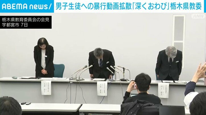 男子生徒への暴行動画拡散「深くおわび」栃木県教委 速報 2026/01/07 23:50 拡大する 栃木県の県立高校で男子生徒が別の生徒に暴行する動画がSNSで拡散されている問題で、県の教育委員会が会見を開き、謝罪しました。 きょう、栃木県の教育委員会は県内の県立高校で男子生徒が別の生徒に殴る蹴るなどの暴行をする動画が拡散している問題について会見を行いました。 県によりますと、動画は去年12月に学校のトイレで撮影されたもので、今月に入り、SNSで動画が拡散されたことで暴力行為を認識したということです。 続きを読む