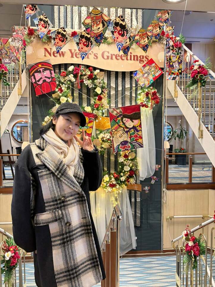 続けて、「4年前初めてお招き頂いた時は5月でしたが今回はお正月なのでさらに豪華!」と新年の華やかな雰囲気の船内の写真を公開するとともに「メンバー&スタッフのみんなもウキウキで乗船しております」と現場の活気ある様子を伝えた。