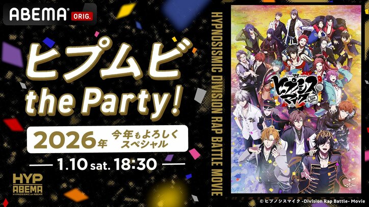 ヒプマイ声優13名集結の生特番『ヒプムビ the Party! 2026年今年もよろしくスペシャル』1月10日放送決定!「重大情報」解禁も ヒプノシスマイク 2026/01/09 07:00 拡大する ABEMAにて、『ヒプノシスマイク -Division Rap Battle-』の特別番組『ヒプムビthe Party!2026年今年もよろしくスペシャル』が、1月10日(土)18時30分より独占無料生放送されることが決定した。また同日20時からは、映画『ヒプノシスマイク -Division Rap Battle-』をキャストと共に鑑賞する「応援上映会」がABEMA PPVにて配信される。 『ヒプノシスマイク』は、2017年9月に始動したプロジェクト。各ディビジョンを代表するチームがラップバトルを繰り広げ、その勝敗がストーリー展開を左右するファン参加型の要素や、本格的な楽曲制作陣の参加により話題を集めてきた。 続きを読む 2026年冬アニメ(1月クール) 作品情報 もっとみる(67) 綺麗にしてもらえますか。 花ざかりの君たちへ 多聞くん今どっち!? Fate/strange Fake カードファイト!! ヴァンガード 29歳独身中堅冒険者の日常