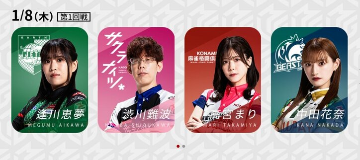 人気女子選手3人の前に立ちはだかる“魔神”渋川難波 チームの窮地を救えるか?/麻雀・Mリーグ Mリーグ 2026/01/08 19:00 拡大する Mリーグ機構は「大和証券Mリーグ2025-26」、1月8日の第1試合に出場する4選手を発表した。好調選手2人、苦戦中の選手2人ながら、実力伯仲の好カードが実現した。勝敗の分かれ目は、どこで訪れるか。 EX風林火山・内川幸太郎(連盟)とセガサミーフェニックス・竹内元太(最高位戦)は、ともに3ケタプラスと好調。しっかりとチームに貢献できている。一方、赤坂ドリブンズ・鈴木たろう(最高位戦)は、年末にようやく初勝利。U-NEXT Pirates・仲林圭(協会)も約200ポイントのマイナスは、らしくない。まるでタイトル戦かという顔触れにもなっっただけに、一瞬の隙、牌1枚の後先で、展開が大きく変わりそうだ。 続きを読む