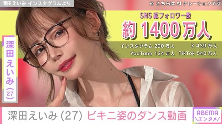 深田えいみ(27)、ビキニ姿のダンス動画公開「うひょー!!」「やばすぎ!」「もうメロメロ!」など絶賛の声 ABEMAエンタメ 2026/01/09 12:30 拡大する SNSの総フォロワー数約1400万人を誇る人気セクシー女優の深田えいみ(27)が8日、Instagramを更新。ビキニ姿でダンスを踊るセクシーな動画を投稿し、「うひょー!!」「やばすぎ!」「もうメロメロ!」など、絶賛する声が寄せられている。 これまでにもInstagramに、透け感が妖艶なミニスカスタイルや、バニーガール、スタイル際立つ水着姿など、色気あふれる衣装でのダンス動画を投稿している深田。 続きを読む