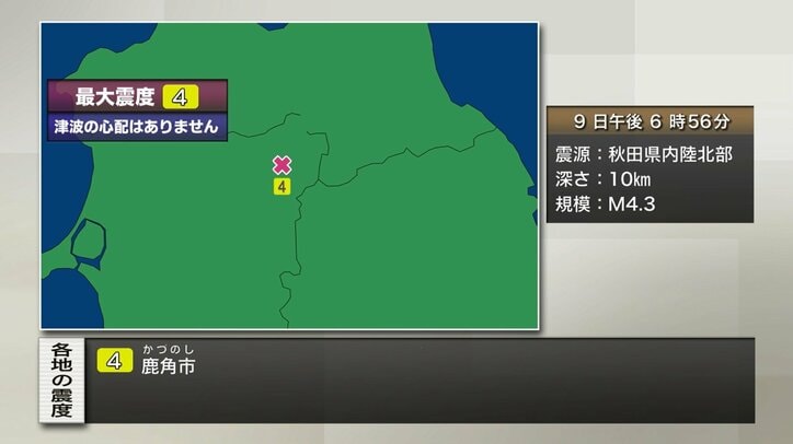 秋田で震度4 津波の心配なし 午後6時56分ごろ 速報 2026/01/09 19:09 拡大する 午後6時56分頃、東北地方で震度4の地震がありました。この地震による津波の心配はありません。震源 秋田県内陸北部 深さ 10km M4.3 震度4 鹿角市 今後の情報に注意してください。(ANNニュース) 続きを読む