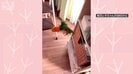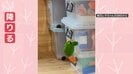 別の日も…。この日も飛ぶことなく、ケースの取っ手をくちばしと脚でつかみながら、降りていきます。