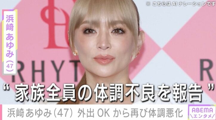 “息子ら家族全員の体調不良を報告”浜崎あゆみ(47)、外出OKから再び体調悪化「布団から出ないで」など心配の声 ABEMAエンタメ浜崎あゆみ 2026/01/14 15:04 拡大する 家族全員の体調不良を報告していた歌手の浜崎あゆみ(47)が13日、Instagramのストーリーズを更新。外出許可が下りた後に再び体調を崩したことを明かし、心配の声が寄せられている。 自宅に飾った巨大なクリスマスツリーの前ではしゃぐ様子や、公園の遊具で遊ぶ写真など、息子2人との生活をInstagramで紹介している浜崎。9日に更新したストーリーズでは、「家族がみんなインフル2周目になってしまったと昨日書いたけど、まんまと わたしも本日2周目迎えました。何この無限ループ」と、自身や子どもたちが体調を崩したことを報告。「鼻かみすぎて、視界にあったティッシュ全部空になり、キッチンペーパーでしのいでたら、顔の下半分が脱皮しまくってきたけど、まぁいいや」と、休養中の様子をつづっていた。 続きを読む