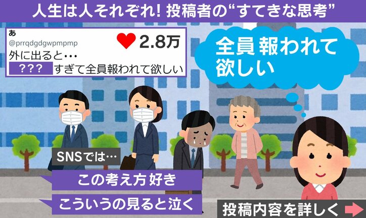 電車内で「全員報われて欲しい」投稿者の“すてきな思考”に反響「その考え素敵」「見えない痛みを抱えながら生きてるだけで十分すごい」 わたしとニュース 2026/01/15 12:00 拡大する 投稿主が電車内で「全員報われて欲しい」と感じた投稿が、話題になっている。 投稿したのは、あ さん(@prrqdgdgwpmpmp)。投稿主が電車に乗っている際、周りの人の顔を見て「平然とした顔で生きてるけど、みんないろんな過去があって、忘れられない人がいるかもしれないわけで、そんな中でも頑張って生きてるの偉すぎて全員報われて欲しい」と考えたことを、Xに投稿した。 続きを読む