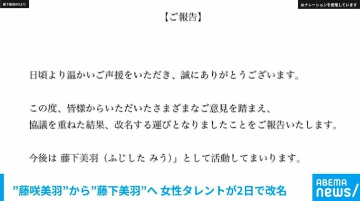“藤咲美羽”から“藤下美羽”へ 女性タレントが2日で改名 速報,ABEMAエンタメ 2026/01/15 18:18 拡大する タレントの藤咲美羽が14日、Xを更新し、デビューから2日で、芸名を「藤下美羽」に改名すると発表しました。 12日にはXで「この度、株式会社プラチナムピクセルに所属することになりました」と報告し、宣材写真を公開。「本日より、藤咲美羽として活動していきます」と伝えていました。 これを受けフォロワーからは、スターダストプロモーション所属の9人組グループ「ONE LOVE ONE HEART」の藤咲碧羽(=18)と、読みが同じアイドルがいることなどを指摘されていました。 続きを読む