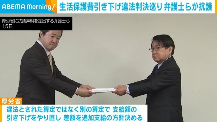 生活保護費の引き下げを違法とした最高裁判決を巡り、厚労省が引き下げた分の全額の支給を見送った対応について、全国の弁護士らが撤回を求める抗議声明を発表しました。