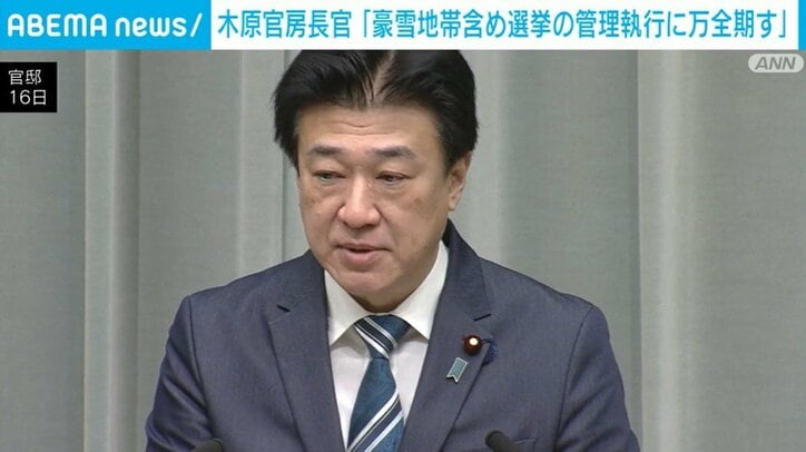 木原官房長官「豪雪地帯含め選挙の管理執行に万全期す」 速報 2026/01/16 15:49 拡大する 来月8日にも投開票が行われる衆議院選挙をめぐり、木原官房長官は、「豪雪地帯も含め選挙の管理執行に万全を期す」と強調しました。木原官房長官「政府としては、豪雪地帯も含め地方公共団体などからのご意見・ご相談とも真摯に対応しながら中央選挙管理会や各選挙管理委員会とも連携し、選挙の管理執行に万全を期してまいります」 木原長官は、選挙の万全な執行のため、これまでも地域によっては繰り上げ投票を実施してきたほか、悪天候等により交通が途絶するなどの事態が考えられる場合には、自衛隊との連絡体制を構築するなどの対応をしてきたと説明しました。 続きを読む