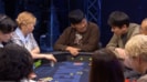 敗者復活でも2人のハンドは絡み合い、この場面では岡野がスペードとダイヤの「10」、濱家がハートとダイヤの「Q」で激突。テーブルに開かれた最初の3カードはハートの「5」「K」とクラブの「J」で、濱家は3000点を追加ベットする。