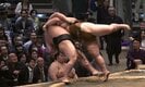 小結・若元春(荒汐)と小結・王鵬(大嶽)の一番。立ち合い前まわしを狙って掴んだのは若元春。王鵬は左を差して応戦。そのまま王鵬が大きな体でがぶって寄り、追い詰めるも、土俵際で若元春が起死回生のうっちゃりに出た。際どくも見える決着だったが、行司軍配は若元春に上がった。
