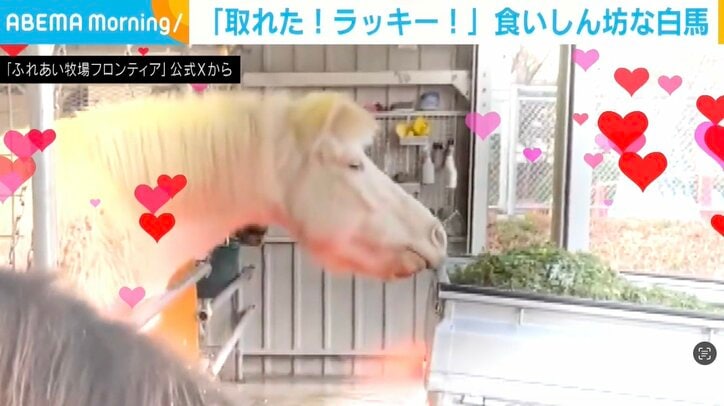 ご飯をフライングして…食いしん坊な白馬に「早く食べないと仕事(笹)に遅れてしまう…!」など反響 ABEMA Morningどうぶつ 2026/01/17 11:15 拡大する 食いしん坊な白馬の様子が、SNSで話題となっている。 トラックの荷台に積まれたご飯をフライングして食べているのは、日本在来馬のハクちゃん(12歳)。ハクちゃんが思わずフライングしてしまったのには理由があったようで、牧場スタッフ(@frontierumako)によると「ふれあい牧場フロンティア」がある富山県の冬は、寒さが厳しく 草がほとんど育たないため、久しぶりに大好きなクローバーが目の前に登場し、 『ラッキー!全部ボクの~』と大興奮したのだろうとのこと。 続きを読む