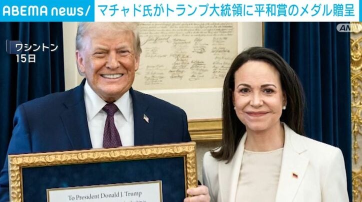 マチャド氏がトランプ大統領に平和賞のメダル贈呈 速報 2026/01/17 15:31 拡大する アメリカのトランプ大統領はベネズエラの野党指導者マチャド氏からノーベル平和賞のメダルを贈られたことについて、「素晴らしい心遣い」と評価しました。トランプ大統領「マチャド氏は『あなたは8つの戦争を終わらせた。歴史上、あなた以上にノーベル平和賞にふさわしい人物はいない』と言ってくれた。その心遣いは本当に素晴らしかった」 トランプ氏は15日にホワイトハウスでマチャド氏からノーベル平和賞のメダルを贈られました。トランプ氏は翌日、マチャド氏について「立派な人物で、非常に感銘を受けた」と記者団に述べました。 続きを読む