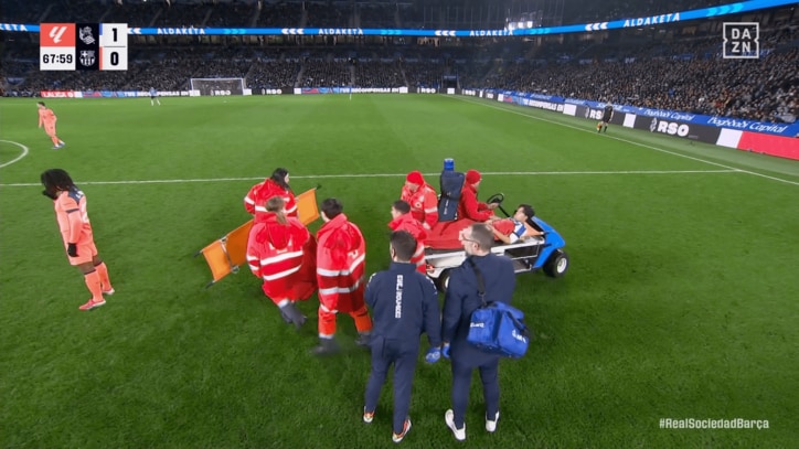 アクシデントが発生したのは、1点リードで迎えた66分だった。バルサの猛攻を凌いだソシエダがカウンターを狙う。左サイドに流れたFWミケル・オヤルサバルへボールが出たタイミングで、自陣ボックス手前にいた久保が裏を狙ってフルスプリントを開始した。そこへオヤルサバルからのパスが出ると、DFエリック・ガルシアとの競争に。しかしハーフウェイライン付近に差し掛かったタイミングで、久保が左の太腿を押さえてピッチに転がった。