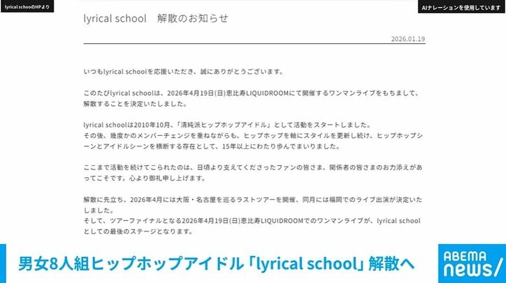 男女8人組ヒップホップアイドル 「lyrical school」 解散へ 速報,ABEMAエンタメ 2026/01/20 14:03 拡大する lyrical schoolからの発表です。「いつもlyrical schoolを応援いただき、誠にありがとうございます。このたびlyrical schoolは、2026年4月19日(日)恵比寿LIQUIDROOMにて開催するワンマンライブをもちまして、解散することを決定いたしました。lyrical schoolは2010年10月、『清純派ヒップホップアイドル』として活動をスタートしました。その後、幾度かのメンバーチェンジを重ねながらも、ヒップホップを軸にスタイルを更新し続け、ヒップホップシーンとアイドルシーンを横断する存在として、15年以上にわたり歩んでまいりました。ここまで活動を続けてこられたのは、日頃より支えてくださったファンの皆さま、関係者の皆さまのお力添えがあってこそです。心より御礼申し上げます。解散に先立ち、2026年4月には大阪・名古屋を巡るラストツアーを開催、同月には福岡でのライブ出演が決定いたしました。そして、ツアーファイナルとなる2026年4月19日(日)恵比寿LIQUIDROOMでのワンマンライブが、lyrical schoolとしての最後のステージとなります。今後とも、最後の瞬間まで応援の程、何卒よろしくお願いいたします。lyrical school運営」 (『ABEMA NEWS』より) 続きを読む