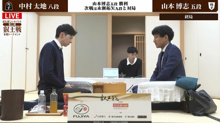 山本博志五段が中村太地八段に快勝!解説者絶賛「振り飛車の魅力を伝える一局」 自身初の8強入り/将棋・叡王戦本戦 将棋 2026/01/21 07:30 拡大する 将棋の第11期叡王戦本戦トーナメント1回戦が1月20日、東京・渋谷区の将棋会館で行われ、山本博志五段(29)が中村太地八段(37)に106手で勝利した。 山本五段は自身初となる2回戦に進出。次戦では、タイトル戦常連の超強豪・永瀬拓矢九段(33)と対戦する。 ABEMAでテキスト解説を務めた佐藤慎一六段(43)は、「後手番ながら積極的な動きを見せた振り飛車がペースを握りました。先手の右金が5九の地点で囲いの足を引っ張るような形で、後手の山本五段が4筋の歩を突き捨てて仕掛けていったのはさすが“スペシャリスト”といった感じでした」とコメント。 続きを読む