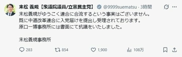 原口議員が「2人で立ち上げ」とした立憲・末松議員が「ゆうこく連合」入りを否定「中道改革連合に入党届」 原口議員は「とんでもない」 速報,会見 2026/01/20 20:31 拡大する 立憲民主党の末松義規衆院議員は19日、自身のXに「末松義規がゆうこく連合に合流するという事実はございません。既に中道改革連合に入党届けを提出し受理されております。原口一博事務所には書面にて抗議をいたしました」と、事務所名で投稿した。 原口一博衆院議員は19日記者会見を開き、中道改革連合には加わらず、政治団体「ゆうこく連合」の政党化を目指したうえで「ゆうこく連合」から衆院選に立候補することを表明。立憲民主党からはほかに末松義規議員が加わり、「たった2人のスタート」で政党要件に必要な国会議員5人を目指すとしていた。 続きを読む