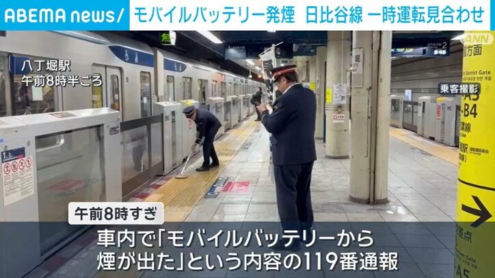 モバイルバッテリー発煙 日比谷線 一時運転見合わせ 速報 2026/01/21 14:46 拡大する けさ、車内でモバイルバッテリーから煙が出た影響で、東京メトロ・日比谷線は全線で一時運転を見合わせました。 午前8時すぎ、日比谷線の車内でモバイルバッテリーから煙が出たという内容の119番通報が東京メトロの係員からありました。 東京メトロなどによりますと、モバイルバッテリーは乗客が持っていたということで、車両が八丁堀駅にとまった際に消火活動が行われ、回収されました。けが人はいませんでした。 日比谷線は車内点検のため全線で一時運転を見合わせ、午前8時30分ごろに再開しましたが、およそ3万6000人が影響を受けたということです。(ANNニュース) 続きを読む