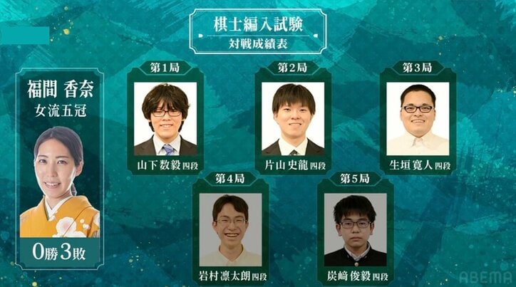 ※3月27日に行われた第3局は福間香奈女流五冠が敗れ、試験不合格となりました。