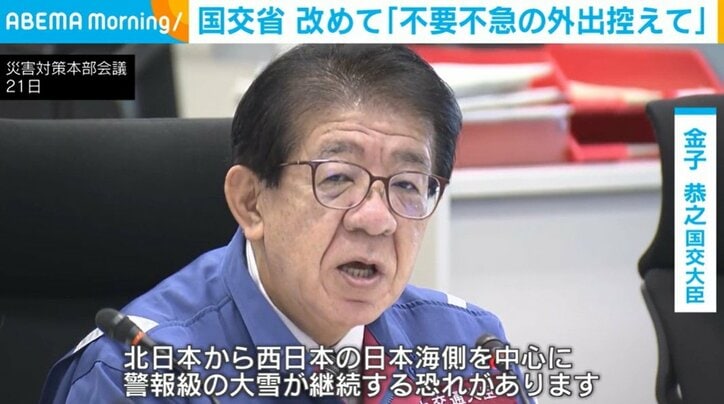 国交省 改めて「不要不急の外出控えて」 速報 2026/01/22 08:28 拡大する 国土交通省は、大雪に関する特定災害対策本部会議を開き、住民らに改めて不要不急の外出を控えるよう呼びかけました。金子国交大臣「北日本から西日本の日本海側を中心に、警報級の大雪が継続する恐れがあります」「大雪の場合には、不要不急の外出を控えるなど、引き続き、ご理解とご協力をよろしくお願い申し上げます」 21日に開かれた特定災害対策本部会議で、金子大臣は道路会社や鉄道会社などへ除雪態勢の確保や、道路の予防的な通行止めの実施、鉄道の計画運休など、必要に応じて措置をとるよう指示しました。 続きを読む