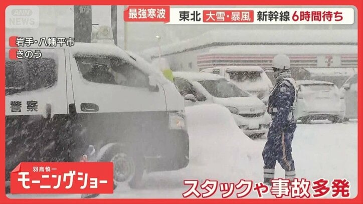 暴風雪警報が発表された岩手でも、前を走る車がぼんやりと見える程度の視界となり、車のスタックや事故が多発。幹線道路が通行止めとなり、警察官が対応に追われていました。