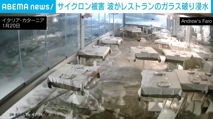 窓の近くまで迫る波→ガラス突き破り一気に浸水!各地でサイクロン「ハリー」の深刻な被害 イタリア わたしとニュース 2026/01/23 18:00 拡大する イタリア・カターニアのレストランで1月20日、波にガラスを破られるレストランの様子が撮影された。 海岸沿いに建つレストラン。窓のすぐ近くまで波が迫ってきている様子が、映像で確認できる。 一度、波が引いた次の瞬間、ガラスを突き破りレストランの中まで水が入ってきた。床はあっという間に水浸しになった。 サイクロン「ハリー」が南ヨーロッパを襲い、イタリアのシチリア島、サルデーニャ島、カラブリア州のほか、マルタや、スペインのカタルーニャ地方を襲い、各地で深刻な被害をもたらしている。 続きを読む