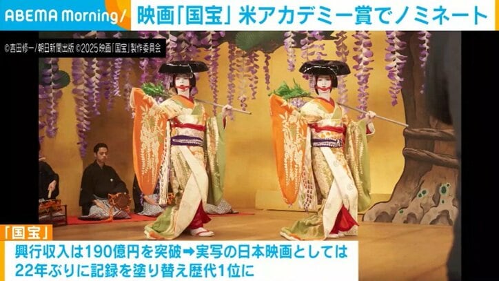 映画「国宝」 米アカデミー賞でノミネート 速報 2026/01/23 08:21 拡大する 映画界の最高栄誉・アメリカのアカデミー賞で、日本の歌舞伎の世界を描いた「国宝」がメイクアップ&ヘアスタイリング賞にノミネートされました。 22日、第98回アカデミー賞各賞の候補が発表されました。このうち、メイクアップ&ヘアスタイリング賞に「国宝」が日本作品として初めてノミネートされました。 李相日監督が2010年から構想を温めて、歌舞伎の世界を圧倒的な映像美で描いた「国宝」。興行収入は190億円を突破。実写の日本映画としては22年ぶりに記録を塗り替え、歴代1位となるなど社会現象となっています。 続きを読む