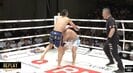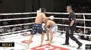 試合開始から、前に出てプレッシャーをかけたのは安彦、コーナー際で飛び膝蹴りを繰り出しペースを握る。UEDAも相手に飲まれず低く振りかぶった右フックで対抗するが、前進してきたタイミングが安彦の射程距離にハマり、ワンキャッチの掴み際から左膝を顔面へ突き上げると“グシャリ”と骨同士がぶつかり合う鈍い音。