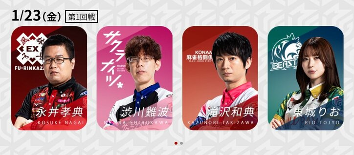 久々登場の滝沢和典、首位・EX風林火山を追いかけるトップなるか/麻雀・Mリーグ Mリーグ 2026/01/23 19:00 拡大する Mリーグ機構は「大和証券Mリーグ2025-26」、1月23日の第1試合に出場する4選手を発表した。注目はリーグ2位・KONAMI麻雀格闘倶楽部の選手兼監督・滝沢和典(連盟)。久々の出場で、どこまでポイントを稼げるか。 首位を快走するEX風林火山を追いかけるKONAMI麻雀格闘倶楽部だが、チームの勝ち頭が監督でもある滝沢。少し体調を崩し戦列を離れていた間に、BEAST Xの躍進もあり、3位に後退した瞬間もあった。順調に行けばレギュラーシーズン突破は確実なだけに、今はとにかく上を目指してブンブンと腕を振りたいところ。滝沢が監督自ら、その手本を示せるか。 続きを読む