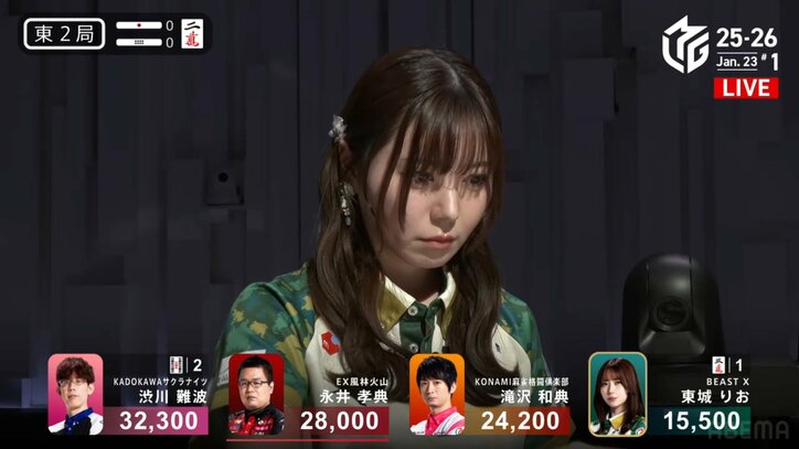 美女キャプテンが「すごい顔してましたよ」ライバルの不穏な動きに危険察知レーダーが発動?目がキョロキョロ…表情変化に「今のりおの顔好き」/麻雀・Mリーグ Mリーグ 2026/01/24 12:00 拡大する 美女に目が激しく動く。それは何かの気配を察したからか…。「大和証券Mリーグ2025-26」、1月23日の第1試合でBEAST X・東城りお(連盟)が、ライバルの不穏な動きに、目をキョロキョロと動かしたことで、解説者から「すごい顔してましたよ」とツッコミを入れられる場面があった。 東城の目が大きく開かれたのは東2局のことだ。トップ目を走るKADOKAWAサクラナイツ・渋川難波(最高位戦)が中をポン、さらに八万を両面チーと積極的な仕掛け。カン5索待ちでテンパイした。同巡、東城も手を進めてカン三万待ちでテンパイ。ひるまずにリーチを宣言した。ところがこのリーチに、一発で危険牌を切ってきたのがKONAMI麻雀格闘倶楽部・滝沢和典(連盟)だ。涼しい顔で四万をツモ切り。これには東城もただならぬ気配を察知したのか、大きく目を開いてキョロキョロ。警戒心を露わにした。 続きを読む