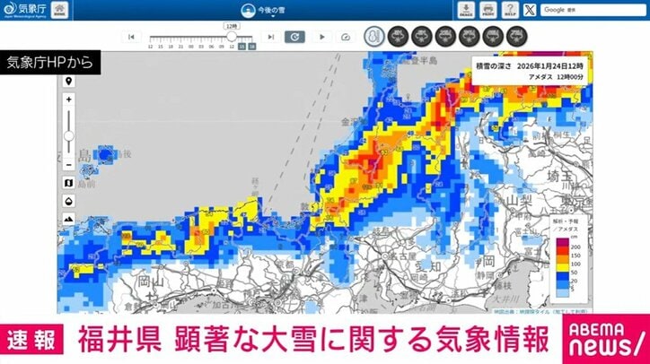 福井県 顕著な大雪に関する気象情報 速報 2026/01/24 13:12 【映像】積雪の深さ(気象庁HP) 福井県では、記録的な大雪になっています。【映像】積雪の深さ(気象庁HP) W正午までの6時間に大野市九頭竜では37センチ、大野市下山では35センチの降雪を観測し、気象庁はさきほど、福井県に「顕著な大雪に関する気象情報」を発表しました。 短時間で、急激に積雪が増えていて、大規模かつ深刻な交通障害が発生するおそれが高まっている状況です。 不要不急の外出は避けるようにしてください。また停電や、集落の孤立などにも注意が必要です。(ANNニュース) 【映像】知っておこう!“雪道の歩き方” これでヒートテックの“寿命”が分かる!? 「寒すぎるのでクリームシチューをジョッキで」22万いいねの大反響 Twitter