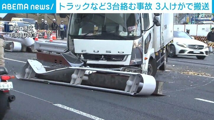 警視庁などによりますと、トラックと乗用車2台が絡む事故があり、それぞれの車を運転していた3人がけがをして病院に搬送されました。いずれも軽傷だということです。