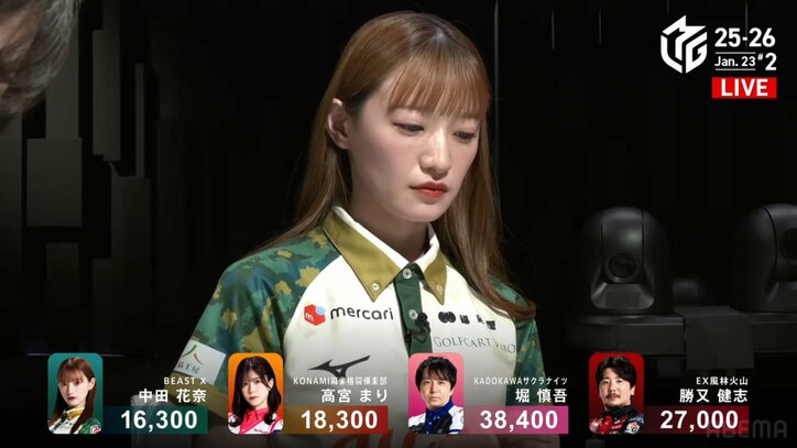 「どう考えても成長してる」中田花奈、アガリ牌を華麗にスルー!直後のツモアガリで着順アップの神業にファン興奮「これはかっこいい!」/麻雀・Mリーグ Mリーグ 2026/01/25 13:00 拡大する この成長は本物だ。「大和証券Mリーグ2025-26」、1月23日の第2試合でBEAST X・中田花奈(連盟)がオーラスで同点3着をよしとせず、あえてアガリ牌をスルー。自力でツモり単独3着に浮上するという神業で、周囲から大絶賛された。 南4局、中田は1万6300点持ちのラス目だった。満貫ツモなら2着浮上まで見えるところだが、最低でも3着目で1万8300点持ちだったKONAMI麻雀格闘倶楽部・高宮まり(連盟)はかわしたいところ。中田は配牌で場風のダブ南の対子、さらにマンズの三面張というチャンスを得た。4巡目、早くもダブ南がポンできたことで、出アガリ2000点で最低でも同点3着、ツモるか高宮直撃なら逆転で単独3着という状況が整った。 続きを読む