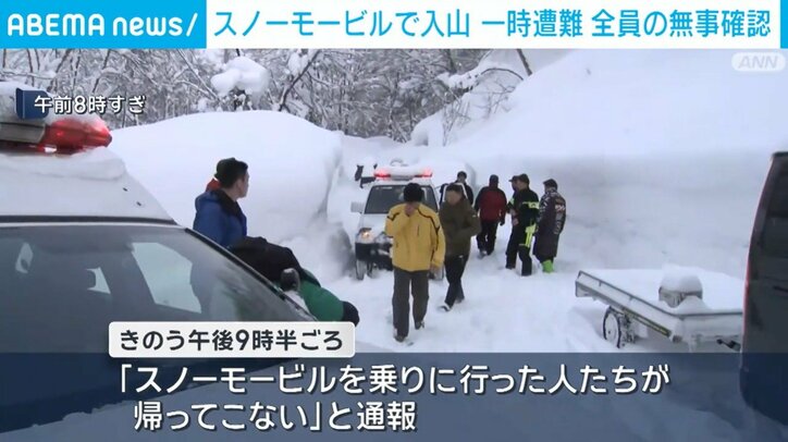 スノーモービルで入山 一時遭難 全員の無事確認 青森・平川市 速報 2026/01/26 12:15 拡大する 青森県平川市でスノーモービルで入山した男性8人が遭難しました。警察などが捜索をする中、さきほど全員の無事が確認されたということです。 青森県平川市の山中では午前8時半ごろから警察や消防などおよそ30人態勢で捜索を続けていたところ午前10時前に救助隊が遭難者に接触したという情報が入ってきました。また午前8時半ごろには遭難者から家族に対し「無事です」と連絡があったということです。 警察によりますと、きのう午後9半ごろ、青森県・平川市で「スノーモービルを乗りに行った人たちが帰って来ない」と警察に通報がありました。およそ10人の男性がスノーモービルに乗車し入山していて、きのうは午後3時から4時ごろに帰宅する予定だったということです。 続きを読む